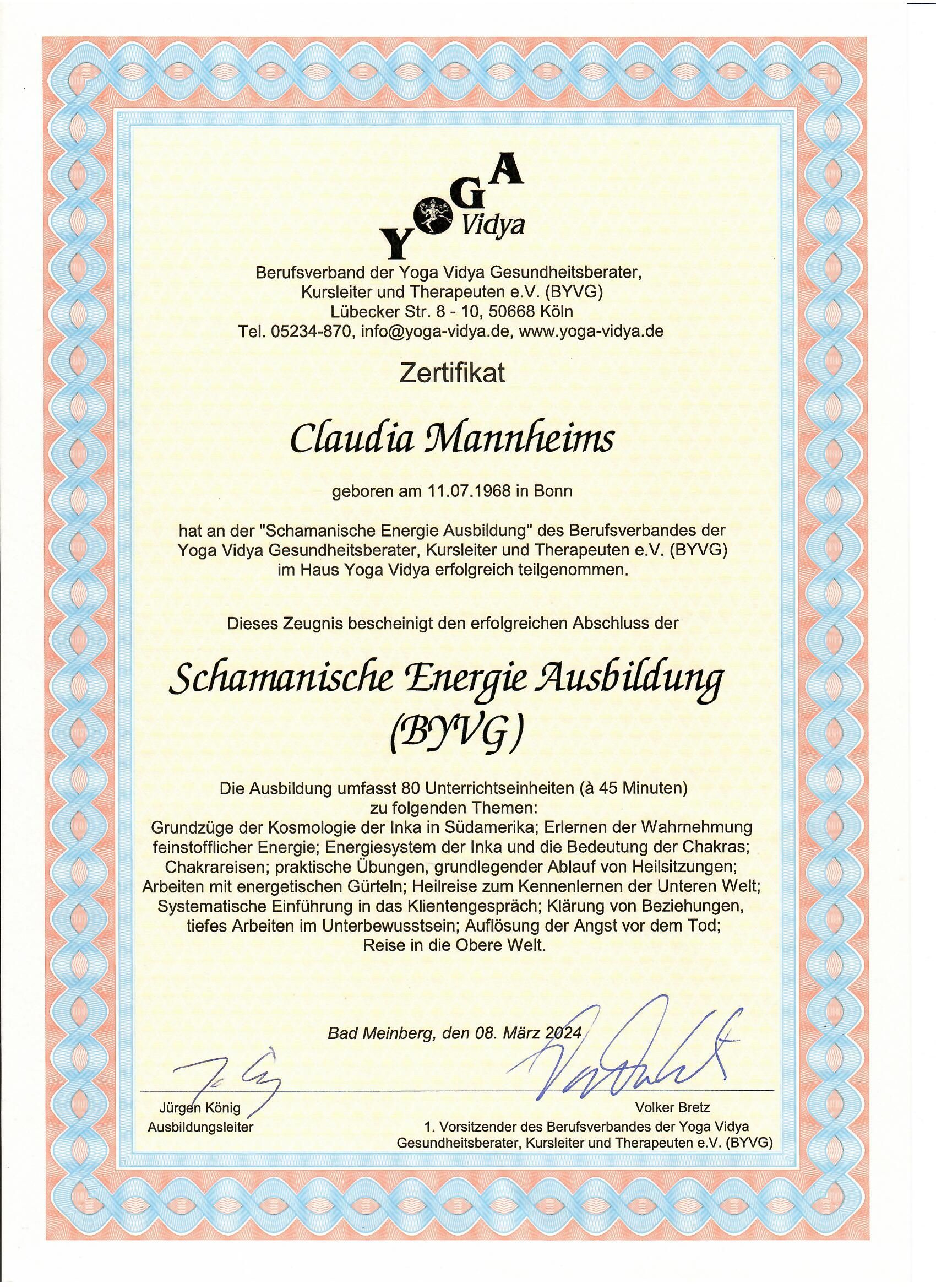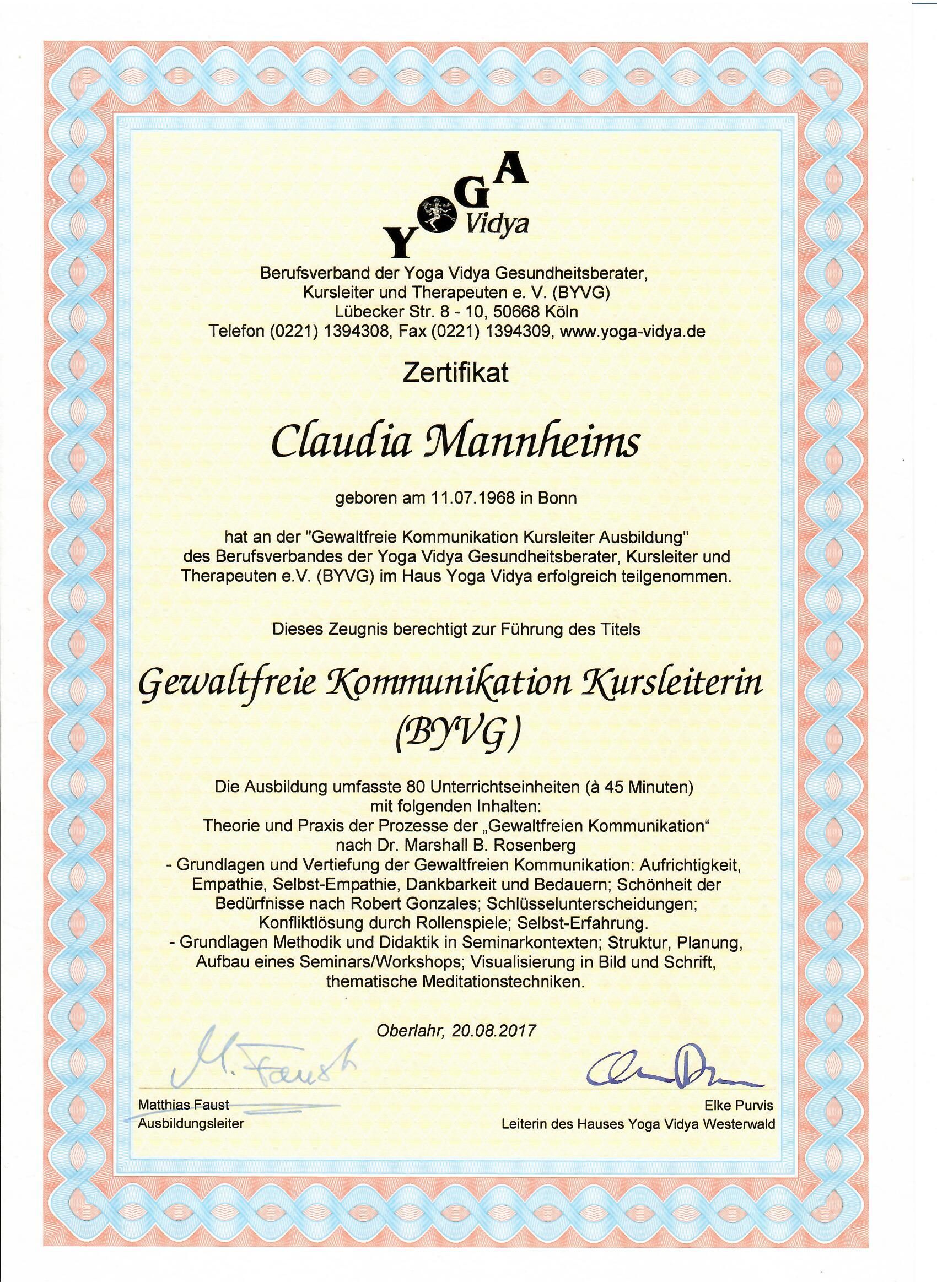 • Zertifizierte Ausbildungen zur Yogalehrerin (2-jährig, Yoga Vidya), Wellnesstrainerin (staatlich zugelassenes Studium beim IST) und zur Kursleiterin in Gewaltfreier Kommunikation nach Marshall B. Rosenberg.